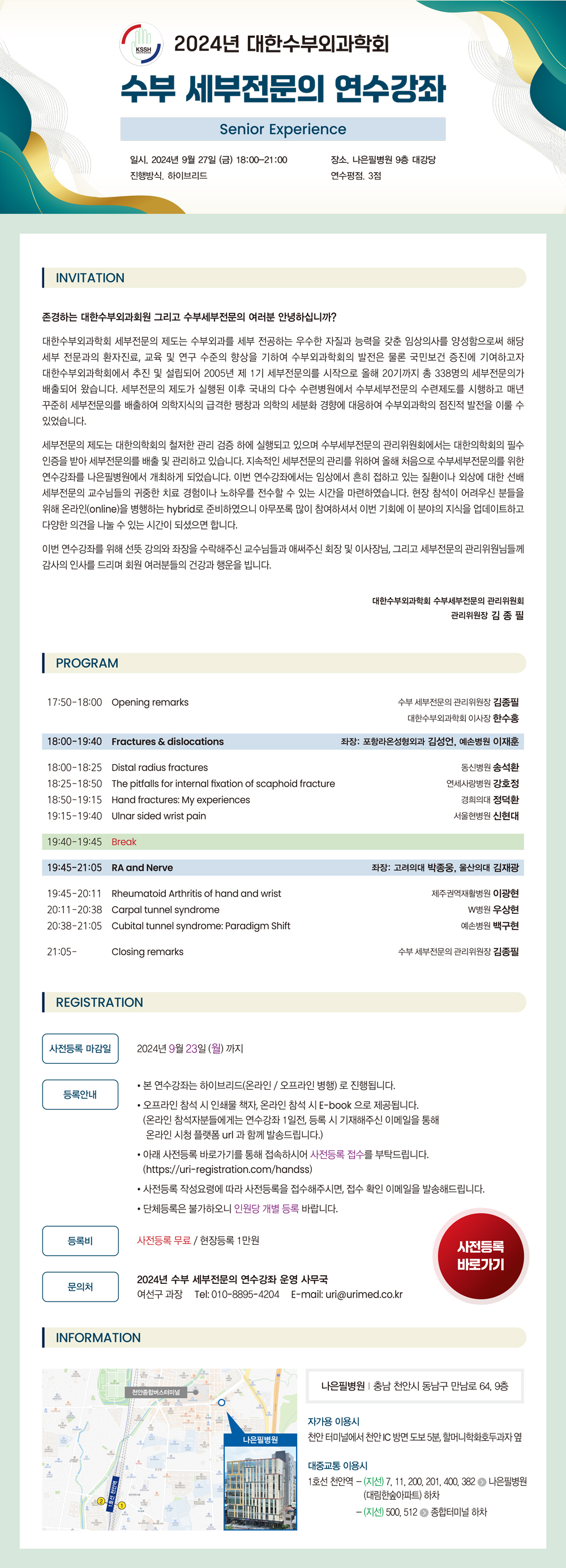 2024년 대한수부외과학회 수부 세부전문의 연수강좌 사전등록 안내