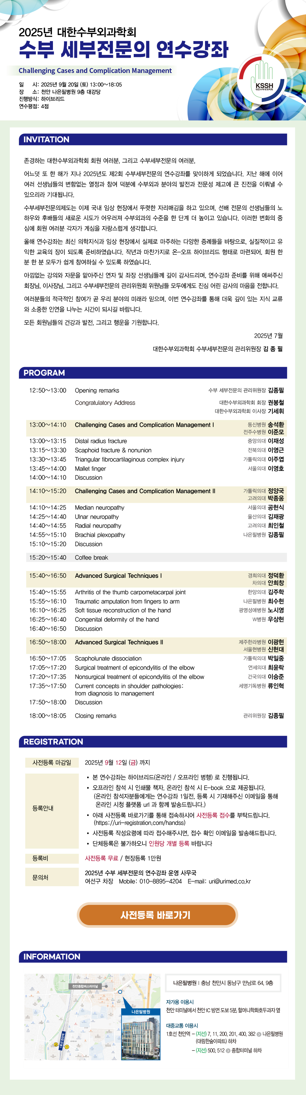 2025년 대한수부외과학회 수부 세부전문의 연수강좌 개최 안내