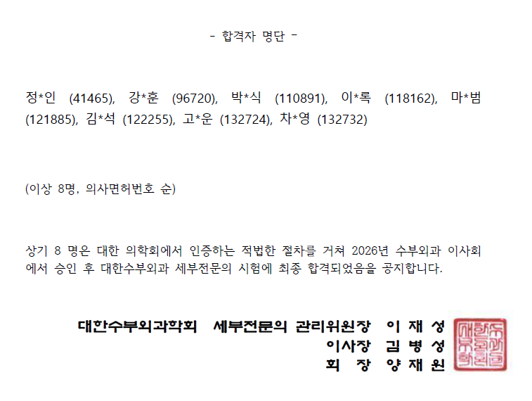 2026 세부전문의 시험 합격자 발표